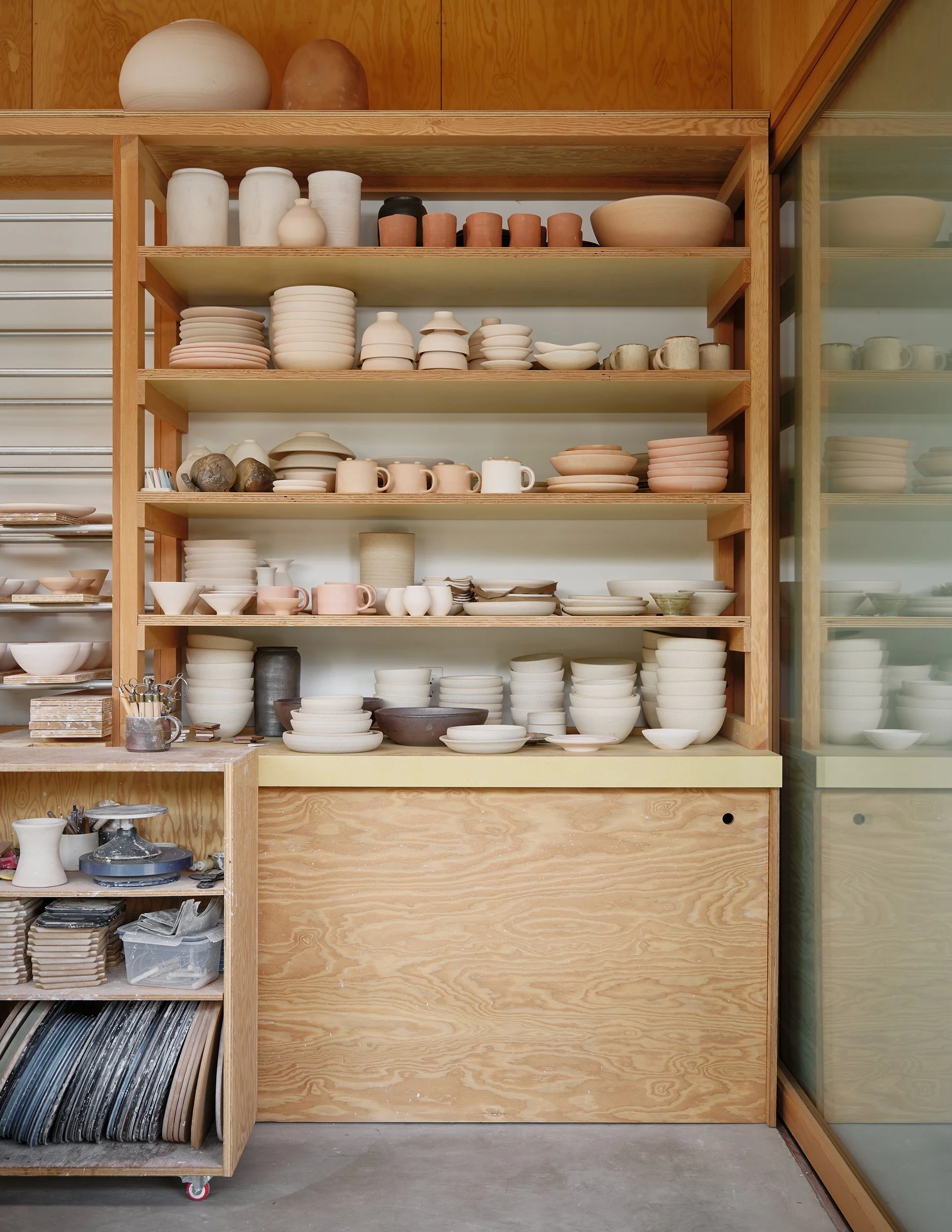 The spatial organization focuses on supporting the practical stages of ceramic production. A light-filled studio forms the core of the building, while a loft above provides additional flexible space that can function as an office or guest bedroom. Outside, a sheltered terrace accommodates kilns, allowing the firing process to occur directly adjacent to the interior workspace. A pronounced cantilevered roof connects these areas, creating a continuous working environment that blurs the boundary between indoor and outdoor activity.